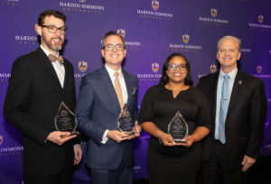 Hardin-Simmons University President Eric Bruntmyer (right) congratulates Outstanding Young Alumni award recipients (left to right) Eric Black, David Krake and Vishia Wilson.