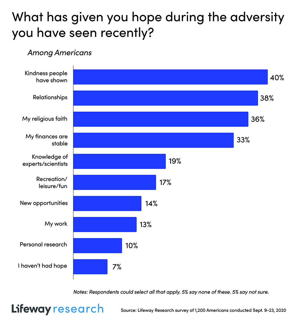 The top source of hope for U.S. adults through 2020 is the kindness people have shown (40 percent), followed closely by relationships (38 percent), their religious faith (36 percent), and their finances being stable (33 percent).