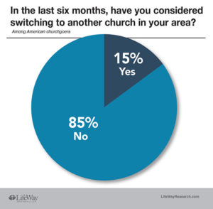 Overall, 15 percent of churchgoers say they have thought about going to another church in the past six months. Eighty-five percent say they have not.