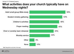 Nine in 10 Protestant pastors say they have some type of activity on Wednesday night, according to a new study from LifeWay Research. Only 10 percent say they have no regular events on Wednesday evening.