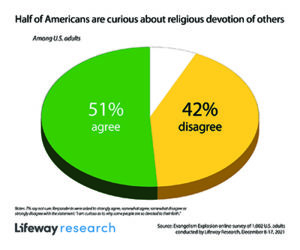 Fewer Americans are open to these types of conversations with people they don’t know, but still, at least half will talk about spiritual matters with a stranger. Half of Americans (51 percent) say they’re at least open to faith discussions with a stranger, with 26 percent saying they’re very open.
