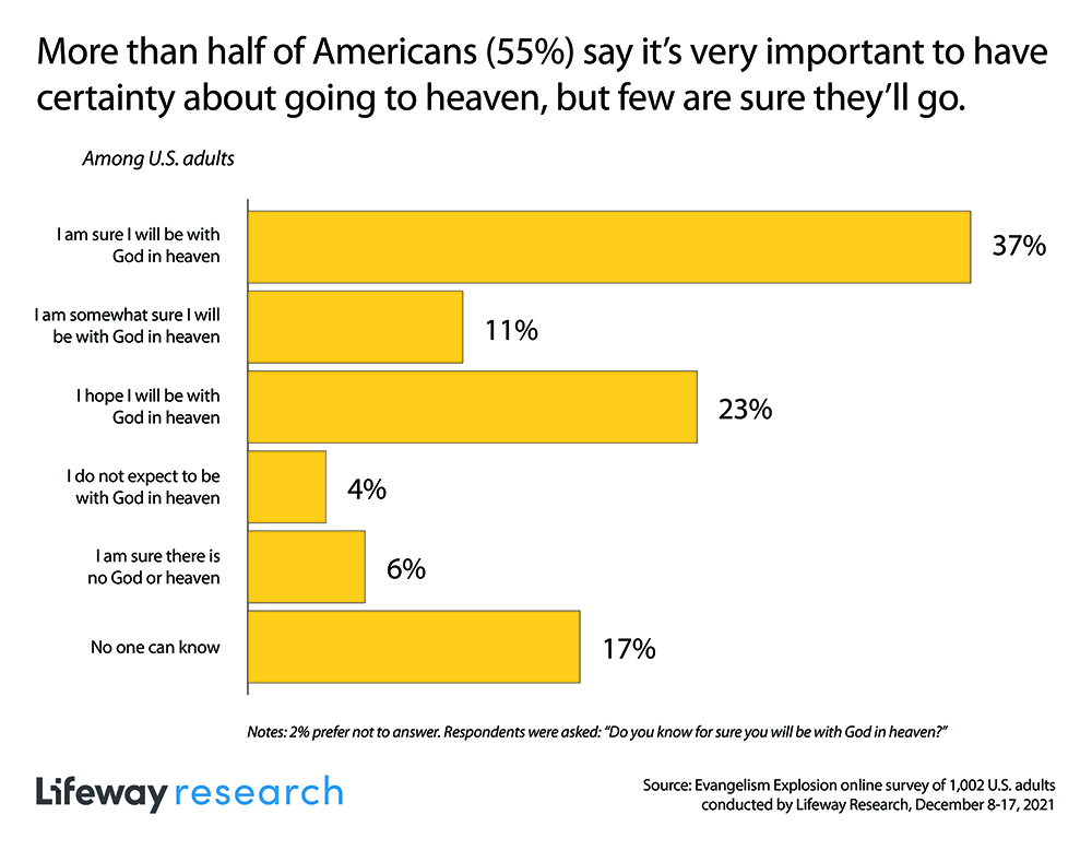 Despite how important most Americans say eternal life is, few say they have such certainty. Slightly more than a third (37 percent) say they are sure they will be with God in heaven. Another 11 percent say they are somewhat sure, while 23 percent say they hope they’ll be in heaven. Few (4 percent) don’t expect to make it, and 6 percent are sure there is no God or heaven. According to 17 percent of Americans, no one can know if they’ll go to heaven.