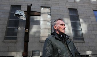 A cross formed from a falling steel I-beam at the former World Trade Center towers was placed outside St. Peter’s Catholic Church in lower Manhattan where Kevin Madigan kept watch over it until its pending move to the National September 11 Memorial & Museum. (RNS PHOTO/John Munson/The Star-Ledger)