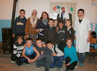 Wayland graduate Melanie Vasquez of Hobbs, N.M., (back row, third from left) joins a group of Balkan children at a Halloween party held at a community center where she works.