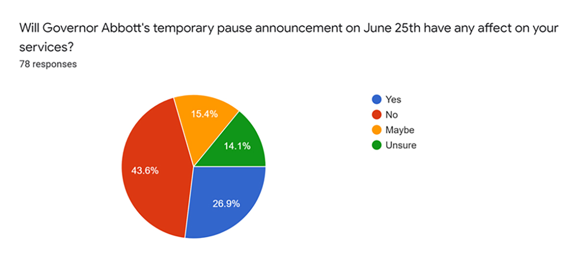 Music ministers from less than half of the churches—43.6 percent—said their services would not be affected by Gov. Greg Abbott’s June 25 announcement that he is pausing the state’s re-opening. More than one-fourth—26.9 percent—said the governor’s announcement would affect their plans, while 15.4 percent said it might and 14.1 percent were uncertain.