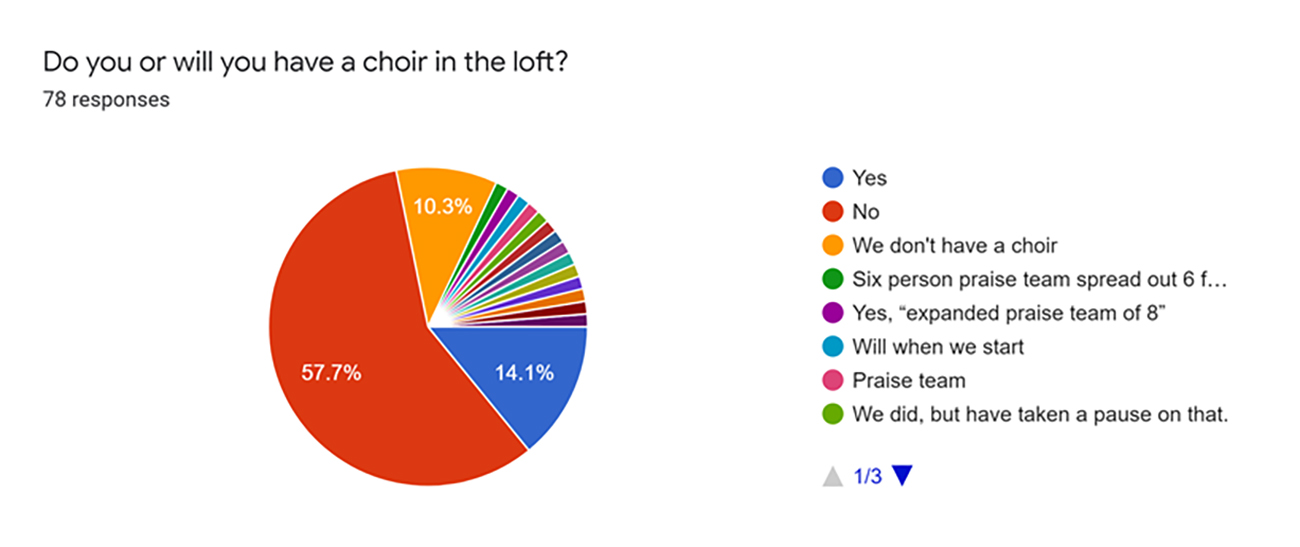 The status of church choirs is considerably more complicated. Only 14.1 percent of the churches have a choir in the loft on Sunday morning or definitely will when they resume gathering; 10.3 percent of the churches didn’t have a choir before the pandemic; and 57.7 percent either don’t currently have a choir or won’t when they resume in-person worship. The remaining churches reported having praise teams of varied sizes or offered other responses.