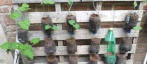 Manos Hermanas teams taught families with limited space how to grow vertical gardens by planting seeds in soil-filled plastic bottles mounted on old wooden pallets.