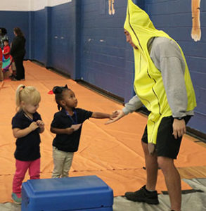 Kinesiology students from East Texas Baptist University staffed a field day Oct. 31 for Washington Early Childhood Center, a school that serves pre-kindergarten students and Marshallās Head Start program. Costumed ETBU students interacted with more than 280 3-year-olds and 4-year-olds, leading them in varied physical activities including parachute play, tricycle riding and obstacle courses to test their fundamental motor skills.
